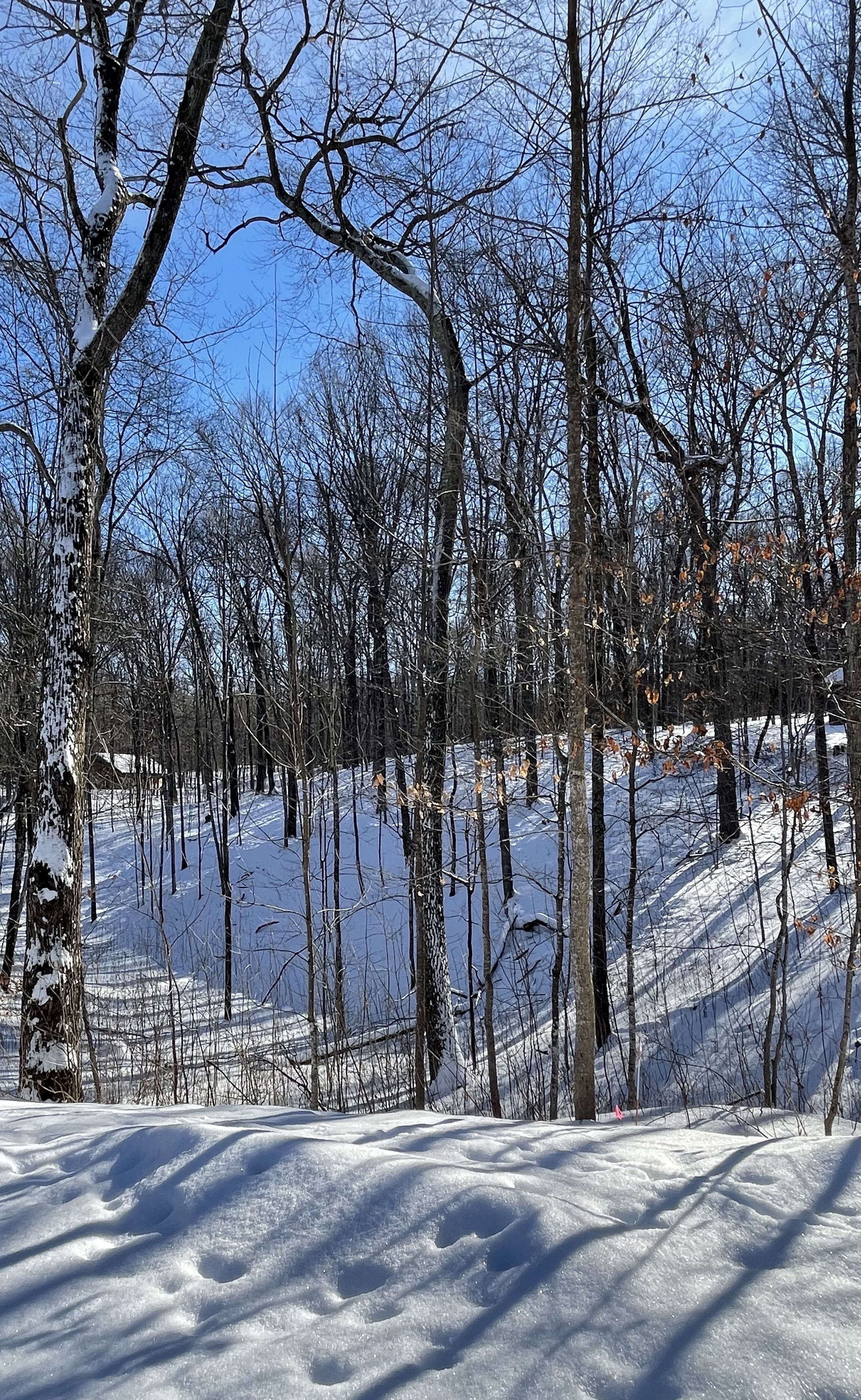 This year the winter in Wisconsin has been hard on the trees. The branches of the white pine were so laden with snow they snapped off leaving raw wood exposed high above and a yard full of sticks below and limbs now frozen under more layers of snow. The spring will reveal a tangled mass of branches. The birch trees are bent and may stay that way. We climb through the snow and move aside newly fallen branches and reclaim the path. Yet strangely grateful for this task, this tussle with the branches and the snapping sound they make. It is a reminder that we have entered another place, the woods and all it offers.